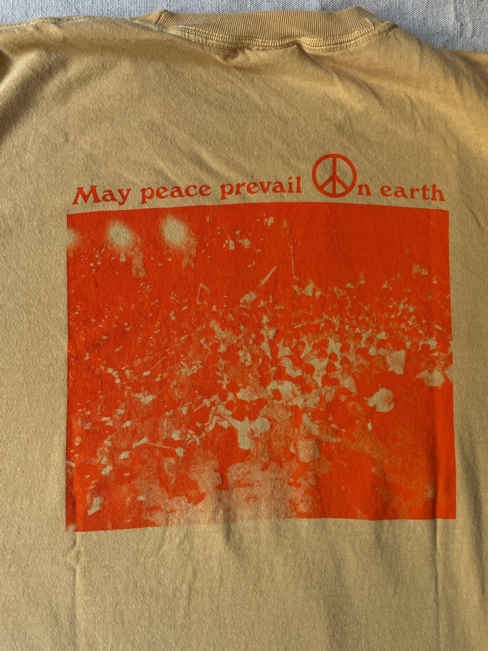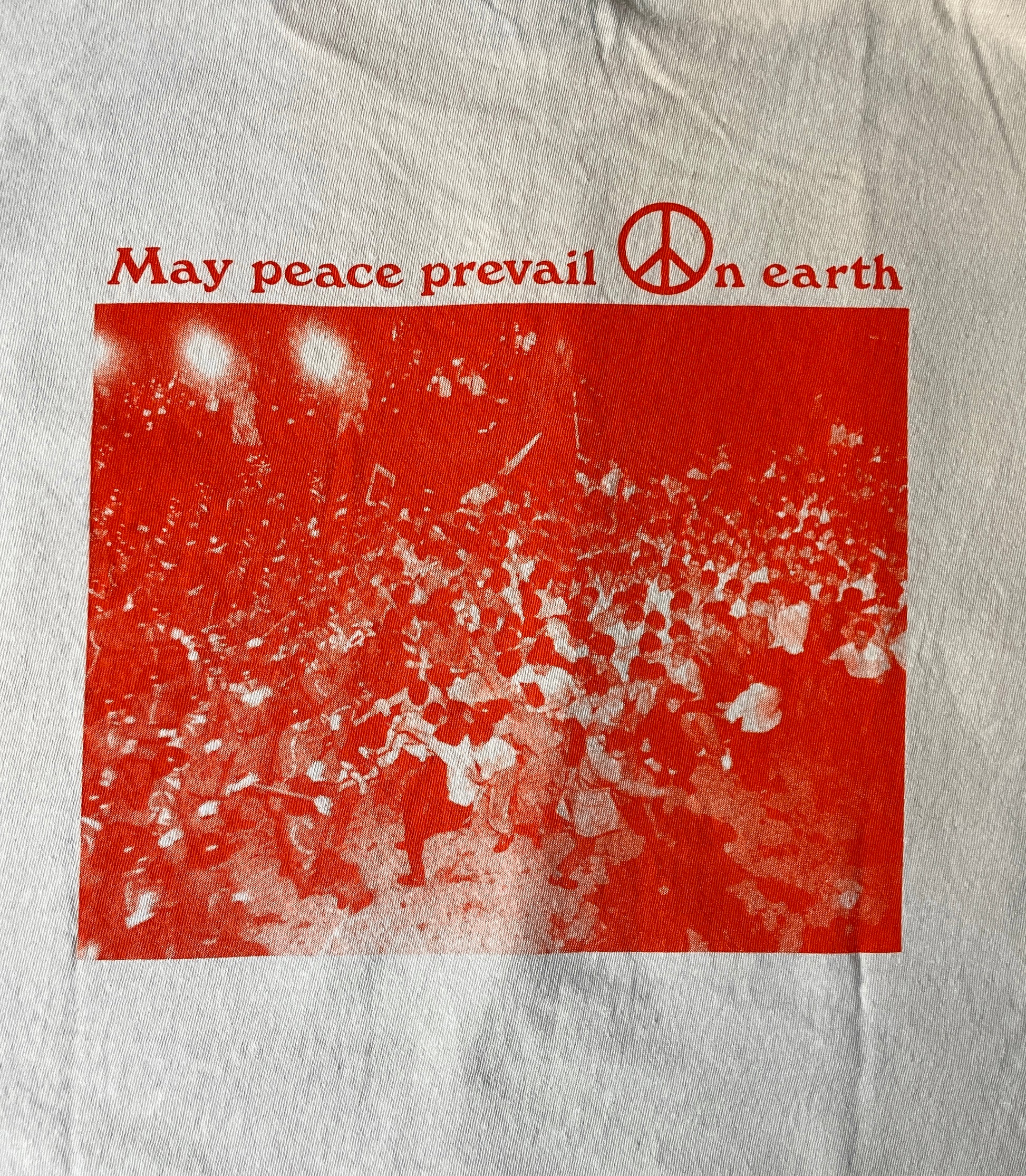 This shirt shows two different ways people make their voice heard. It features a late 60s photo of people with a vision of a different world in Washington Park, NYC on the front and members of the Zengakuren clashing with police in Tokyo on the back. "Of central concern to the Zengakuren was American military presence in the region, and many of the most violent clashes occurred in demonstrations against the Vietnam War." Both images are juxtaposed with the saying that is somewhat superficially incongruent with the image... but still rings true.