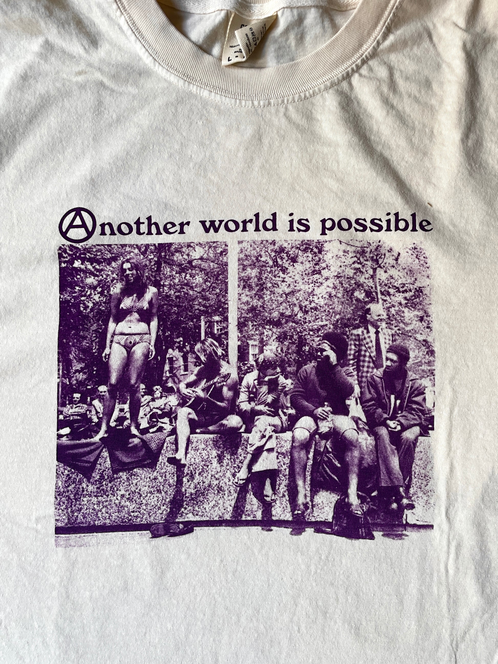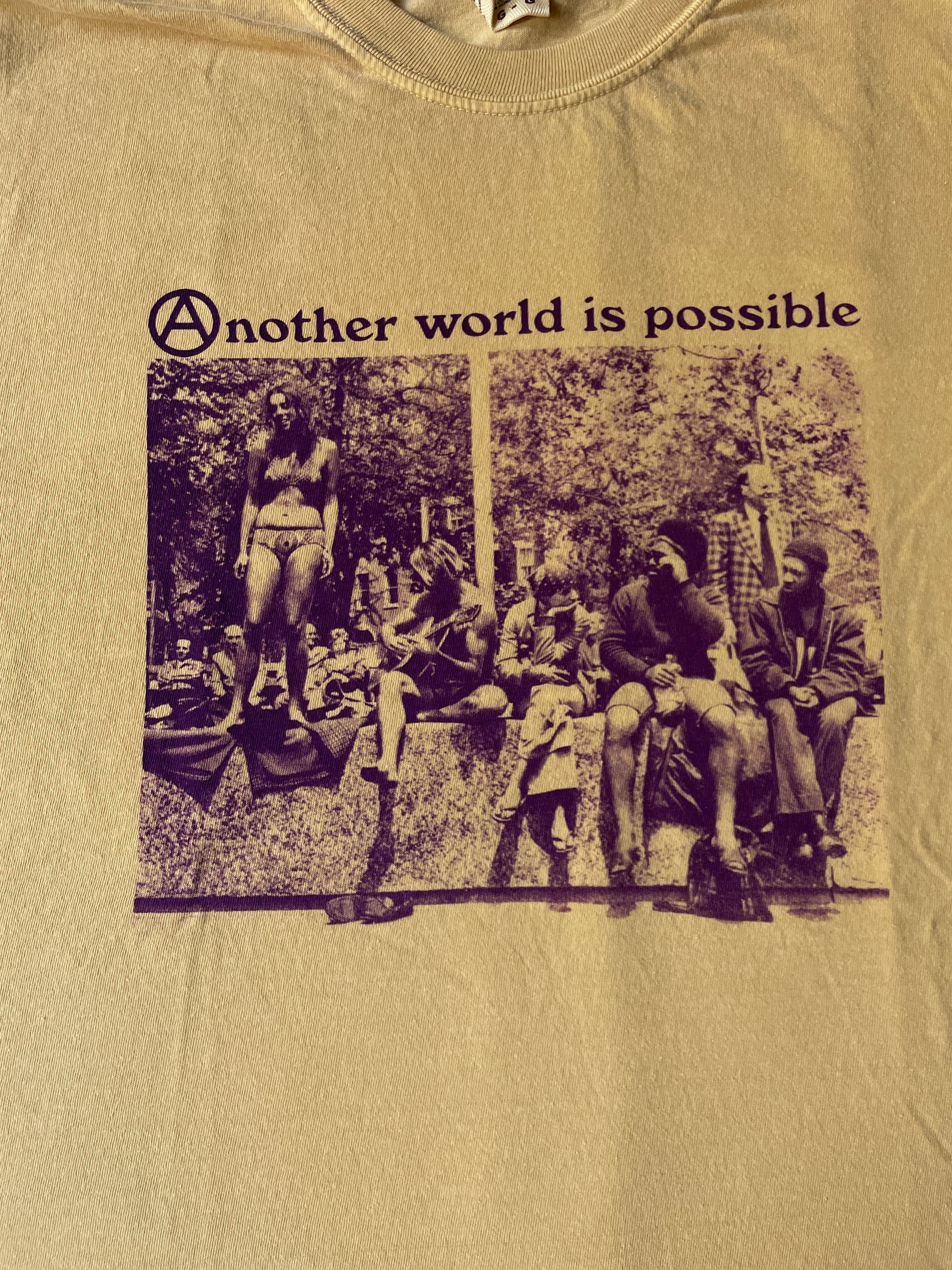 The idea for this shirt came to me when I was in Japan and took note of the Peace Poles at most of the temples there and how the idea of peace prevailing on Earth went hand in hand with the often Anarchist saying that "another world is possible". I thought about the different ways in which we seek peace and how it is not always a clear path but, for many people, the goal is peaceful equality.