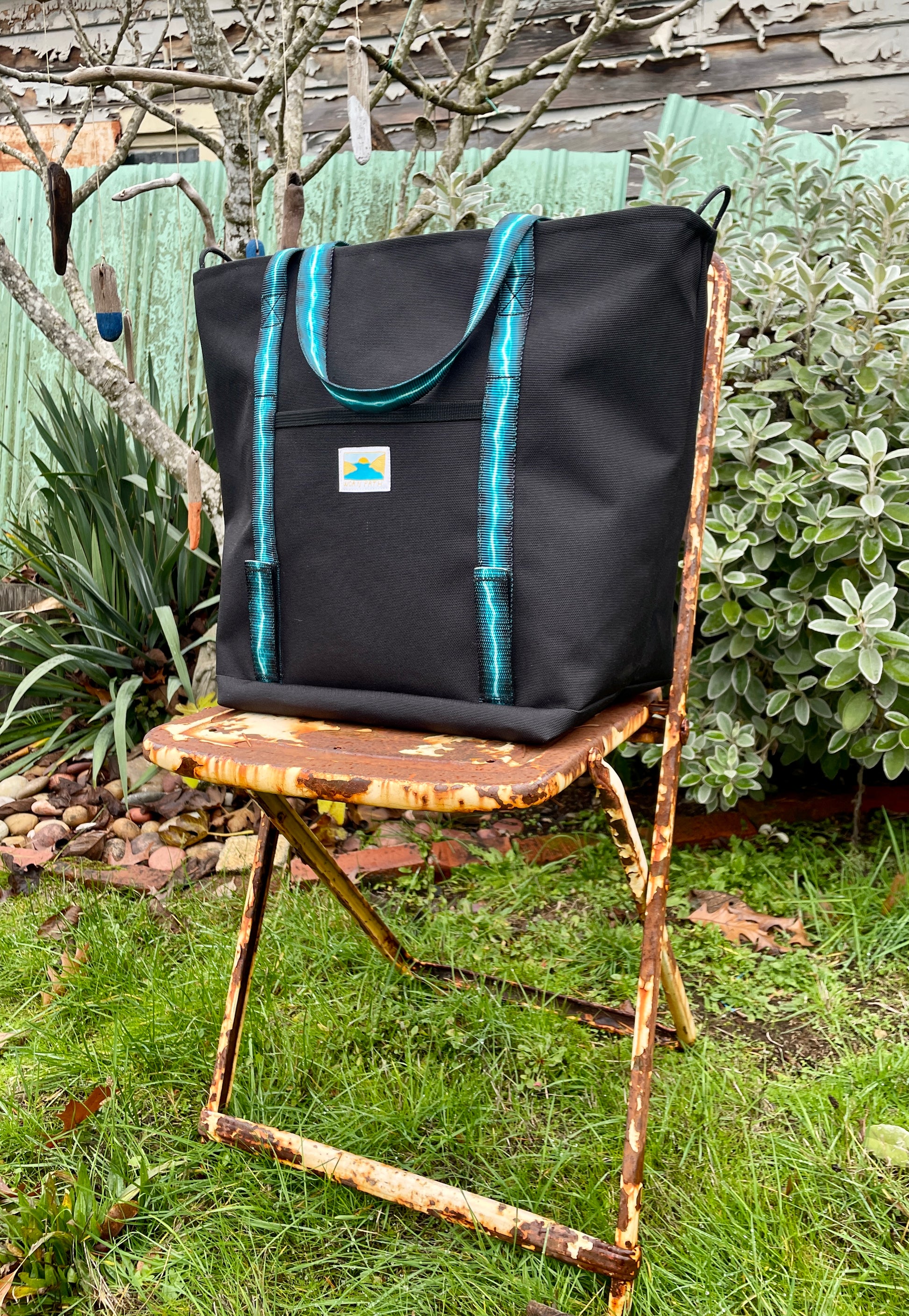 This bag was designed to be an easy transition from your bike basket to walking around but there's no need to use it on your bike if you don't want to! It does have 4 velcro straps to secure it into a basket (2 on each side). It was designed to fit nicely into a Wald basket that is 15"x10" (pretty standard basket). This bag also features a water resistant zipper, an easy access front pocket, paracord loops at the top for extra securing of the bag with a clip or carabiner, and lightning graphic webbing which has 2 flush daisy chain openings on each side for adding straps, etc. . Made here in Portland for us by Hboan Ksor.